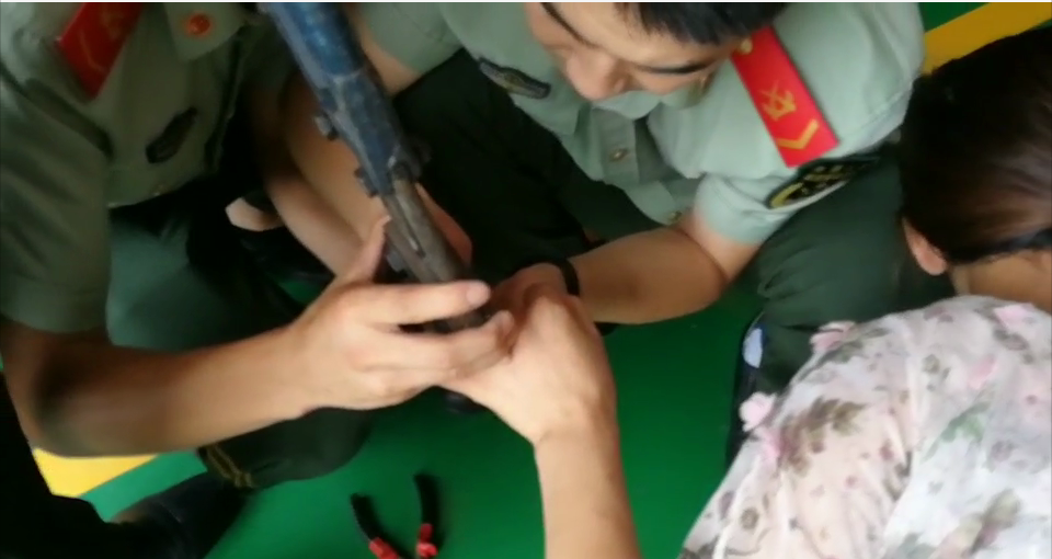 了解情况后,中队立即集合几名有经验的人员对该女子进行救助。经过指挥员观察发现,女子手上戴着一个比一般戒指还要粗很多的戒指,紧紧卡于无名指上,由于戒指卡手时间过长,影响血液循环,手指已经充满瘀血,如不及时采取有效措施,可能会造成严重后果。官兵们迅速取来各类工具开始营救,为了防止在摘除过程中给该女子的受伤手指带来第二次伤害,消防官兵先从矿泉水瓶上剪下一小片塑料卡在戒指与手指之间,使该女子疼痛感减小并起到固定作用,然后使用断电剪和尖锥钳等工具相互配合进行摘除。经过官兵近10分钟的努力,戒指被成功摘除。该女子如释重负,脸上露出笑容。