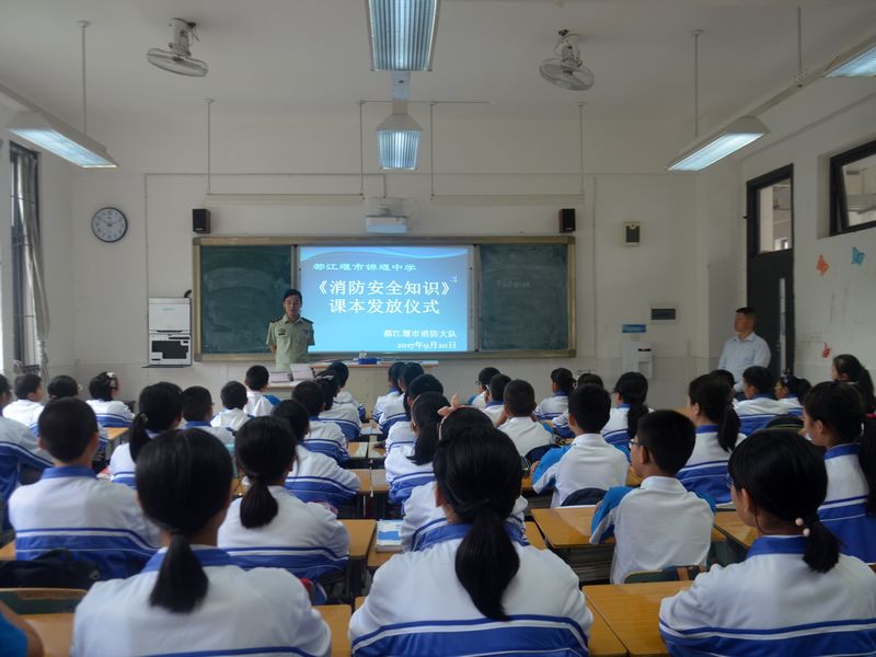 四川新闻网成都9月21日讯(谢树淋 记者 张静)消防安全教育是中小学生安全素质教育的重要内容,是提升国民安全素质的基础工程。增强青少年的消防安全意识,培养预防火灾和报警、逃生、自救互救能力,保护青少年健康成长是全社会的共同责任。9月20日,都江堰市锦堰中学在七年级五班举行了《消防安全知识》读本发放仪式。市教育局刘静明科长、公安消防大队孙夕林教导员出席了发放仪式。