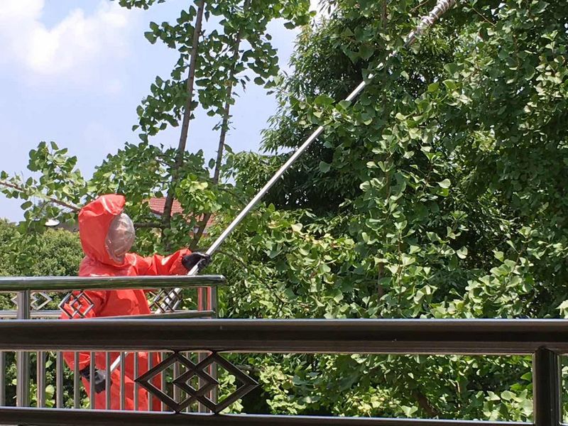 一切准备就绪后,马蜂窝摘除行动立即开始。全副武装的战斗员手拿杀虫剂,小心翼翼接近马蜂窝,先进行喷射,再用杆子取下蜂包。经过一番人蜂大战,蜂患被彻底消灭。为预防马蜂再次筑巢,消防官兵对窝点进行了再清理。