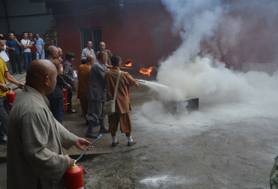 在培训过程中,首先由中队干部向参加培训的消防安全管理人员详细讲解了平时应注意的消防安全基本知识。然后根据寺庙人流量大、人员密集等特点,围绕初期火灾的扑救、如何正确拨打119报警电话、火灾的危害性、火灾的预防、火灾中的自救逃生等方面进行细致的讲解。同时中队干部讲解了在生活中遇到消防安全隐患、堵塞占用消防车通道等行为如何举报等等。最后,在实际操作环节,在中队干部的指导下,参训的安全管理人员们纷纷体验了利用灭火器扑灭油盆火的操作。