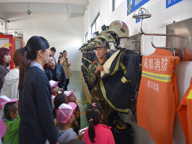 活动中,在消防官兵带领下,全体师生首先参观了中队官兵的内务,了解消防官兵的日常生活。在消防队员的宿舍里,物品摆放整齐简洁,官兵们良好的生活习惯使在场小朋友们深受启发。参观完中队内务,中队宣传员向小朋友详细介绍了消防员在接到警报后的出动过程,以及各种新式消防器材在灭火中的作用。