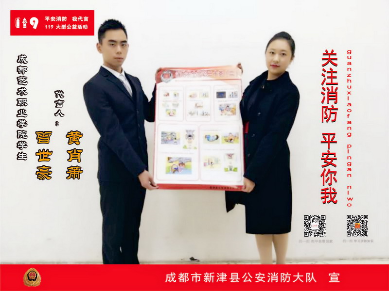 四川新闻网成都11月9日讯(记者 张静)根据总队《“全民消防我代言”大型公益行动方案》及成都市人民政府消防安全委员会《关于开展2017年“119”消防宣传月活动的通知》,新津公安消防大队第一时间研究部署,全面开展“全民消防我代言”大型公益行动,广泛发动社会各界进一步关注消防、学习消防、参与消防,从不同角度、不同层次为消防安全工作代言。