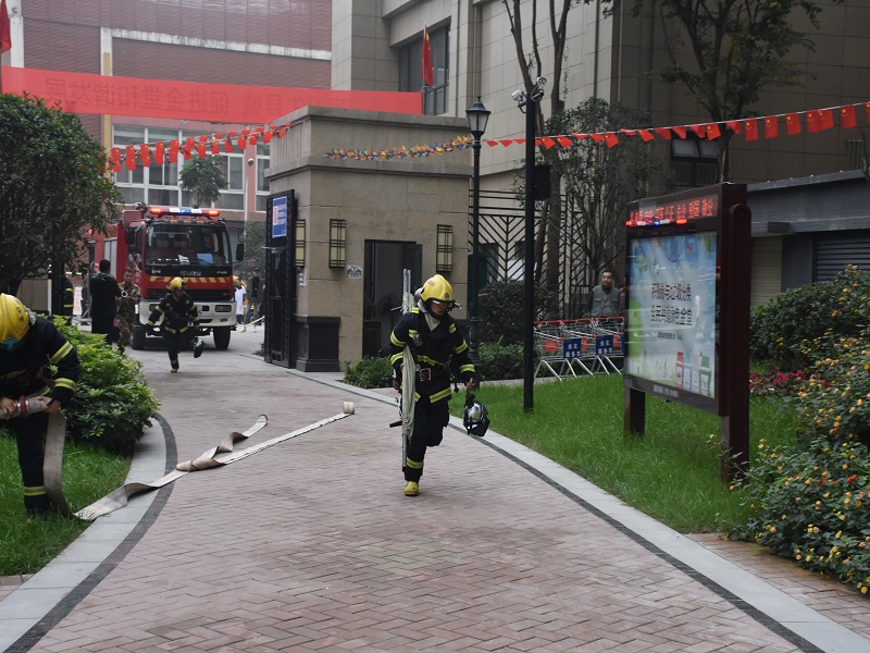 活动中,模拟城投润城小区3幢1单元一住户家中发生火灾 ,据报警人称有人员被困。根据高层建筑和重点防火单位消防应急程序,城投润城物业单位微型消防站启动扑救初起火灾事故的流程,微型消防站兼职消防员全部到位,物业安保人员有序进行人员疏散。消防大队119指挥中心接到火情报警后,立即出动消防车2台、高喷车1台,消防官兵14名赶赴现场“处置”,并由2名医护人员配合消防官兵展开伤员应急救护;现场设置的人员疏散组、安保警戒组、后勤保障组、医疗救护组、灭火组都有序展开救援。5分钟后,“火灾”得到有效控制、小区群众得到有效疏散,高层建筑火灾事故应急救援演习成功。随后,消防大队宣传人员向社区物业单位、企事业单位集中发放《社区安全手册》、《消防安全二十条》、《高层建筑消防安全常识》、《电瓶车消防安全知识》挂图等消防宣传资料,并在活动现场设置消防器材展示区供参加启动仪式人员观摩体验。
