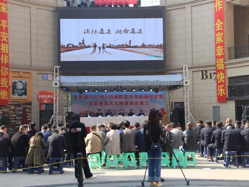 四川新闻网成都11月9日讯(记者 张静)为进一步普及消防安全知识,让更多的人接触消防、认识消防、关注消防,不断提高全民消防安全意识。11月7日下午,大邑县政府在圣桦城广场隆重举行了“11·9”消防宣传月启动仪式暨高层建筑灭火救援综合演习活动。大邑县政府县长廖暾、常务副县长罗四清、副县长巫文化、市公安消防支队副支队长赵亮和县人大、县政协主要领导出席活动,全县各乡镇(街道)、消安委成员单位、公安派出所、消防安全重点单位及物业管理单位主要负责人参加活动,县应急办、消防大队、建设局、卫计局、环保局、气象局、晋原街办等10个应急救援联动单位参加了演习。