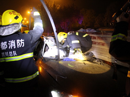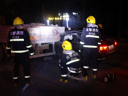 四川新闻网成都11月15日讯(记者 张静)11月15日凌晨1点38分,郫都区119指挥中心接到报警称,安靖镇海霸王路口发生一起车祸,有人员被困车内,请求消防官兵前往救援。区119指挥中心迅速调集安靖专职消防队一台泡沫水罐消防车,一台抢险救援车和12名官兵赶赴现场。