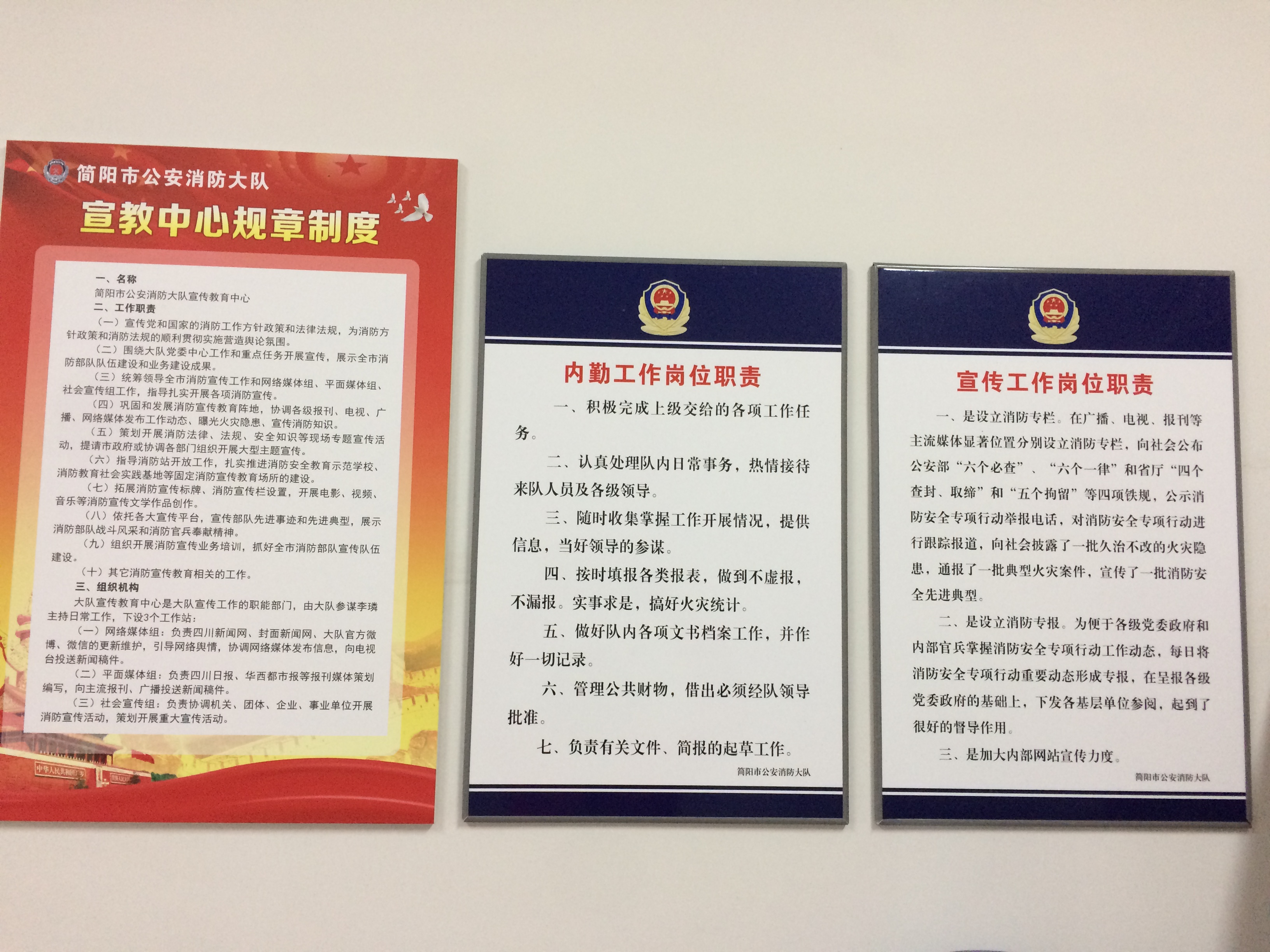 宣教中心制度包含了名称、工作职责、组织机构等方面内容,并按照上级要求,为宣教中心配备了宣传装备、宣传人员。简阳消防大队领导高度重视宣教中心的建设工作,并就此作出重要指示:一是要提高思想认识,充分认清“消防工作,宣传系于一半”的形势;二是要严格根据上级标准,精细打造宣教中心阵地;三是要统筹兼顾,全面整合宣传资源,创新消防宣传方式方法,促进全民消防素质整体提升。
