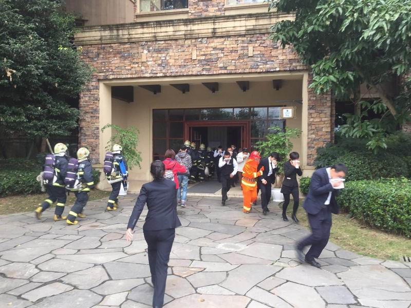 演练假设酒店3楼某客房突发大火,酒店人员发现火灾后,立刻向酒店消防控制中心报告。此时,火势迅速蔓延,产生大量浓烟,造成2人被困着火房间(1人晕倒)。随着应急广播响起,酒店各部门按照预案,迅速组成灭火行动组、设备保障组、医疗抢救组、现场警戒组、疏散逃生组,分别进行扑救初起火灾、人员疏散、现场警戒等工作,同时,拨打119报警电话,请求消防官兵现场施救。