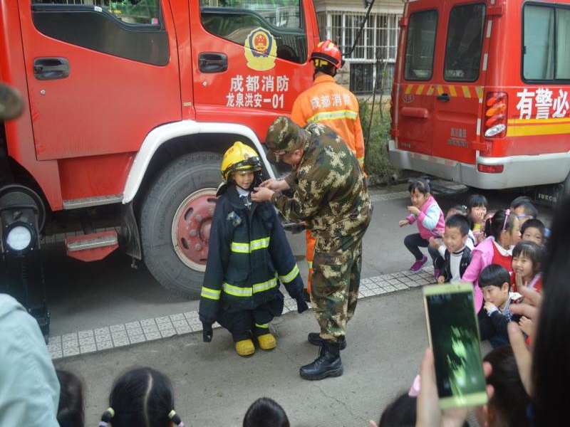 大队官兵来到幼儿园后,受到了小朋友的热情欢迎,不同功能的消防装备、消防战斗服、发电设备、空气呼吸器等救援器材深深吸引了师生们的眼球。“消防叔叔,这些是什么呀?太有趣啦!”小朋友们不禁发出种种疑问,消防官兵趁热打铁,针对幼儿园儿童年龄小、自救意识差、逃生能力弱的特点,耐心细致讲解了各类消防器材功能、操作方法以及基础防火常识、火场自救知识、报警注意事项等,并形象生动地向小朋友们传授了火场安全逃生的动作要领及方法,叮嘱小朋友们在疏散过程中严禁出现推拉、拥堵现象,确保安全,然后用自己的小毛巾捂住口鼻,向楼梯口方向匍匐逃生等方法。随后,消防官兵表演了两盘水带连接操、佩带空气呼吸器、穿战斗服等具有消防特色的项目后,小朋友们跃跃欲试,询问器材功能、试穿战斗服,纷纷争做小小“消防员”。
