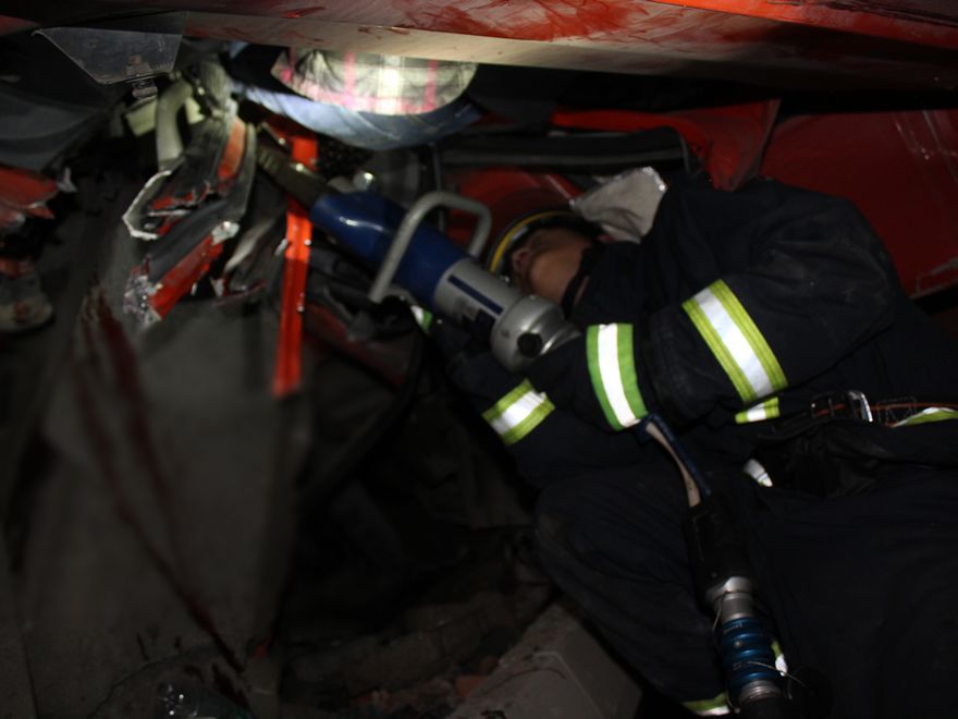 到达现场后,消防官兵通过快速侦查现场发现:一辆大货车侧翻在地,大量砂石倾倒在路边,车头位置变形严重,车辆驾驶员被卡在驾驶室内无法动弹,所幸驾驶员受伤较轻,意识比较清醒,无生命危险。根据现场情况,消防官兵立即部署作战任务:第一组官兵准备破拆器材,准备对被困在驾驶室的驾驶员进行破拆救援;第二组官兵做好现场警戒,保证现场安全。确定任务分工后,消防官兵立即组织破拆,为避免对被困驾驶员造成二次伤害,在做好被困人员安全保护措施后,消防官兵利用液压扩张器对驾驶室进行扩张,然后利用液压剪切钳剪除阻碍物,扩大救援面积。经过30分钟的紧急救援,被困驾驶员被成功救出,消防官兵立刻将被困驾驶员移交120急救人员送往医院进行救治。