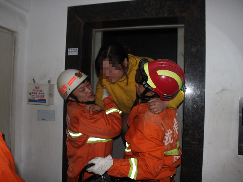 消防官兵到达现场后发现,物业部门的工作人员和电梯公司的维修人员已经在现场进行处置,他们想尽了各种办法都未能将电梯门打开,被困人员情绪显得有点激动,在门外的家属也在焦急的等待救援。考虑到电梯内通风设施差、氧气含量少,如果被困时间过长,很可能将会造成被困人员呼吸困难、昏厥,甚至面临窒息的危险。通过现场侦察和询问后,消防官兵们立即利用电梯钥匙、撬棍等工具将电梯门强行打开,经过官兵大约?5分钟的不懈努力,成功将被困人员救出。