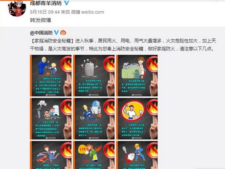 四川新闻网成都9月17日讯 为进一步创新消防宣传模式,引起更多人关注消防安全,适应新形势下网络信息时代的新要求,切实做好换季期间消防安全宣传教育工作,普及推广消防安全常识,提高社会公众消防安全素质,扩大消防宣传的覆盖面,近日,青羊消防大队宣传人员充分利用微博发布消防安全知识和日常生活中防火规范。