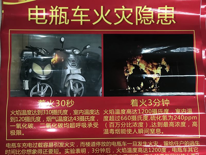 警示挂图就居民老旧院落电瓶车停放存在的问题、电瓶车充电时应注意的事项进行了说明,提醒群众电瓶车充电过载时发生火灾,留给住户逃生的时间相当短暂,电瓶车塑料件容易被引燃,三分钟火焰温度高达1200度,烟气瞬间充斥楼道,产生的毒气足以使上百人窒息而亡,提醒群众要选择正确的逃生方式,留意就近的消防设施,发现小火及时处置,避免小火酿大灾。电瓶车火灾隐患挂图的制作结合直观的图片和简单的文字说明,提醒广大市民如何预防电瓶车火灾以及如何应对电瓶车火灾事故。