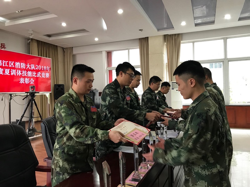 四川新闻网成都10月29日讯(记者 张进春 锁千程)为深入推进和贯彻落实总队及支队夏季练兵工作,全面地考核评价2018年度夏训成效,练好基本功,打好主动仗,不断提高应急救援专业水平,锦江区消防大队下辖4个中队,40余名队员经过紧张激烈的角逐,圆满完成了四个集体项目和三个个人项目的比拼,10月29日,锦江消防大队召开2018年度夏训体技能比武竞赛表彰会,比武竞赛受到表彰的中队、个人及队员代表参加会议。